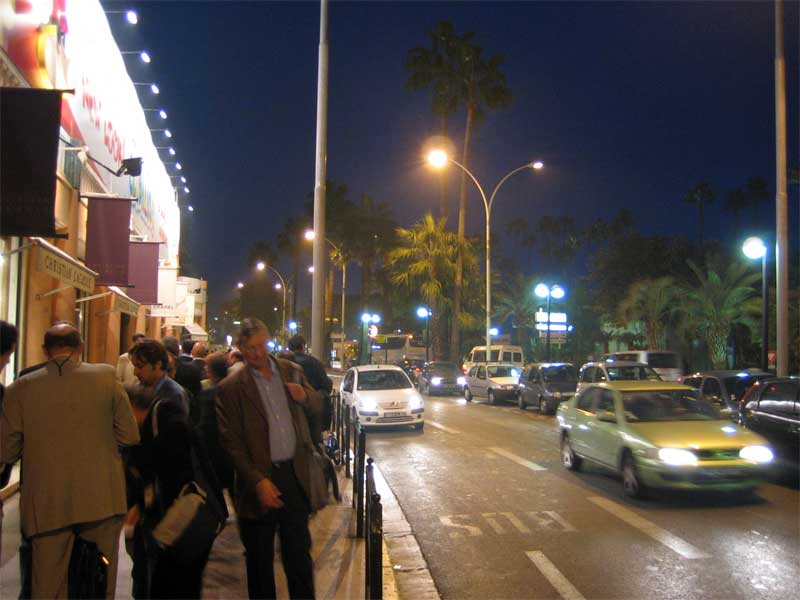 Cannes, La Croisette am Abend. Immer noch jede Menge Messebesucher unterwegs. Zu erkennen an den Schildern um den Hals.