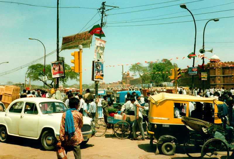 Indien, Neu Delhi im Sommer 1993. Diverse Fortbewegungsmittel sind auf dem Foto: Fahrrad, Rikscha, Motorrikscha und ein altes Auto. Im Hintergrund sieht man den Roten Palast, auch Rotes Fort genannt.