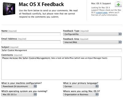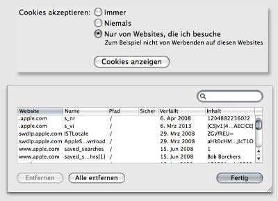 Oben zu sehen die bis 10.4 über die Input Managers noch funktionierende Möglichkeit der Cookieverwaltung mit SafariPlus. Leider ist dieser Hack nicht mehr möglich. Schade dass Apple darauf keinen Wert legt, oder gibt es etwa Geld dafür? Ein Schelm wer Böses dabei denkt, Herr Schmidt! ; )