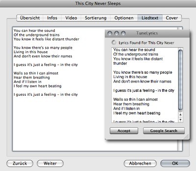 Wer immer mal wieder gerne die Texte zu den gerade in iTunes spielenden Songs hätte, braucht dazu nur das kostenlose TuneLyrics zu starten. Wird ein passender Text gefunden bestätigt man diesen und er wird automatisch in die MP3 Datei eingeschrieben. Einfacher gehts kaum.