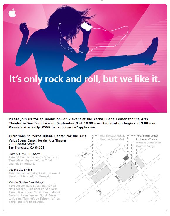 Apple läd wie bereits zu hören war zur Pressekonferenz am 9. September 2009 (19 Uhr MESZ). It’s only rock and roll, but we like it - so das Motto. Neue iPods und iTunes 9 wird es sicher geben, weiteres vermutlich vorerst noch nicht.